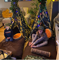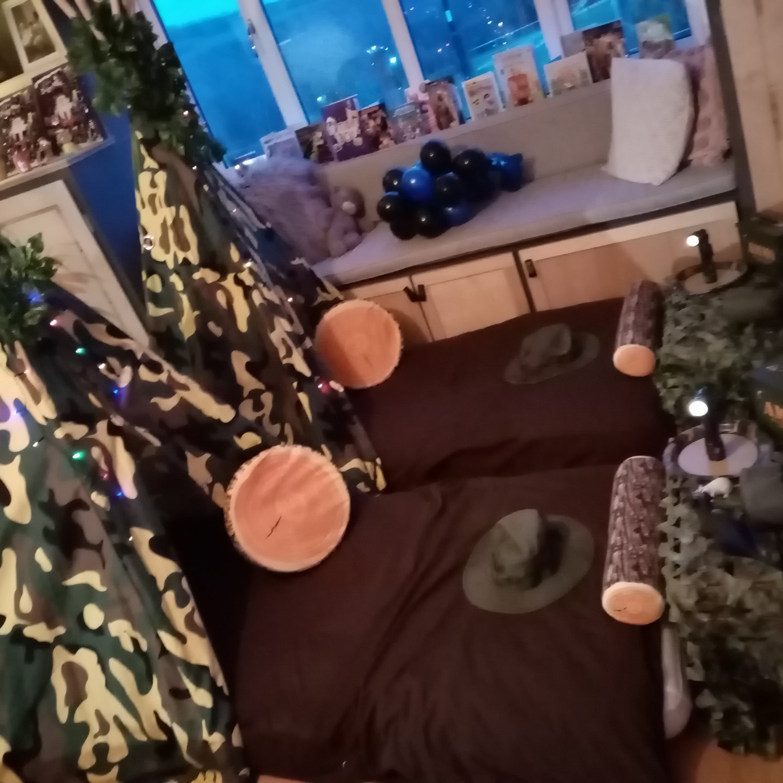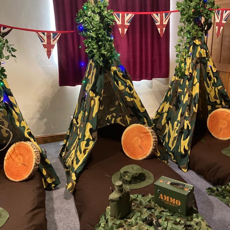 Sleep under camouflage tent, but with one eye open for midnight enemies and spies. Gather around the campfire, sit on cushioned logs and sing along to good old campfire songs.